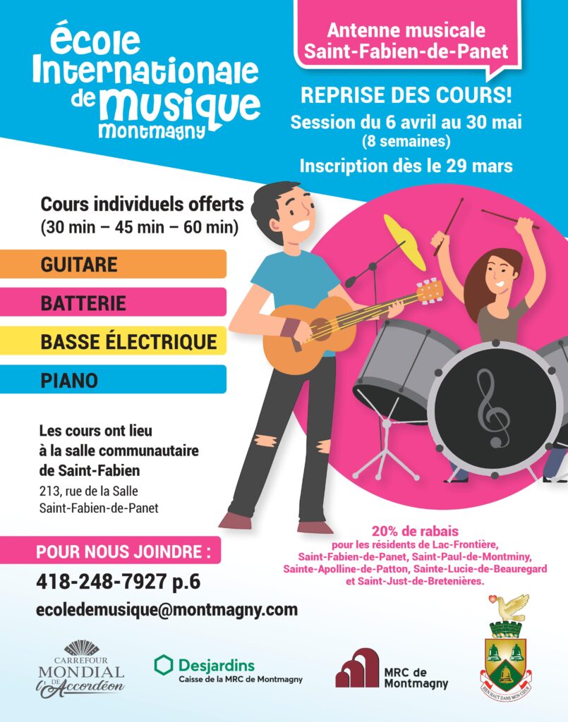 Nouvelles Reprise des cours de musique Par administrateur avril 1, 2021 avril 1, 2021 Share this: Share on X (Opens in new window) X Share on Facebook (Opens in new window) Facebook Les plus populaire Vente de l’ancien véhicule d’urgence La région de la Chaudière-Appalaches repasse en zone rouge et des mesures spéciales d’urgence s’appliqueront pour la Ville de Lévis