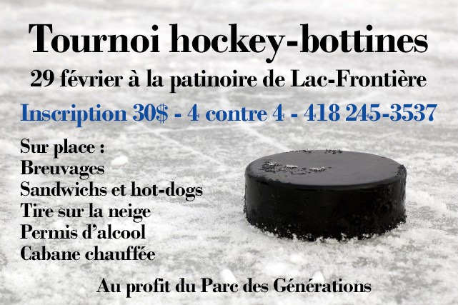 Le 23 février prochain se tiendra une journée d’activés au Lac-Frontière. Tournois de Hockey bottine et glissade, raquette, etc pour les plus petits.